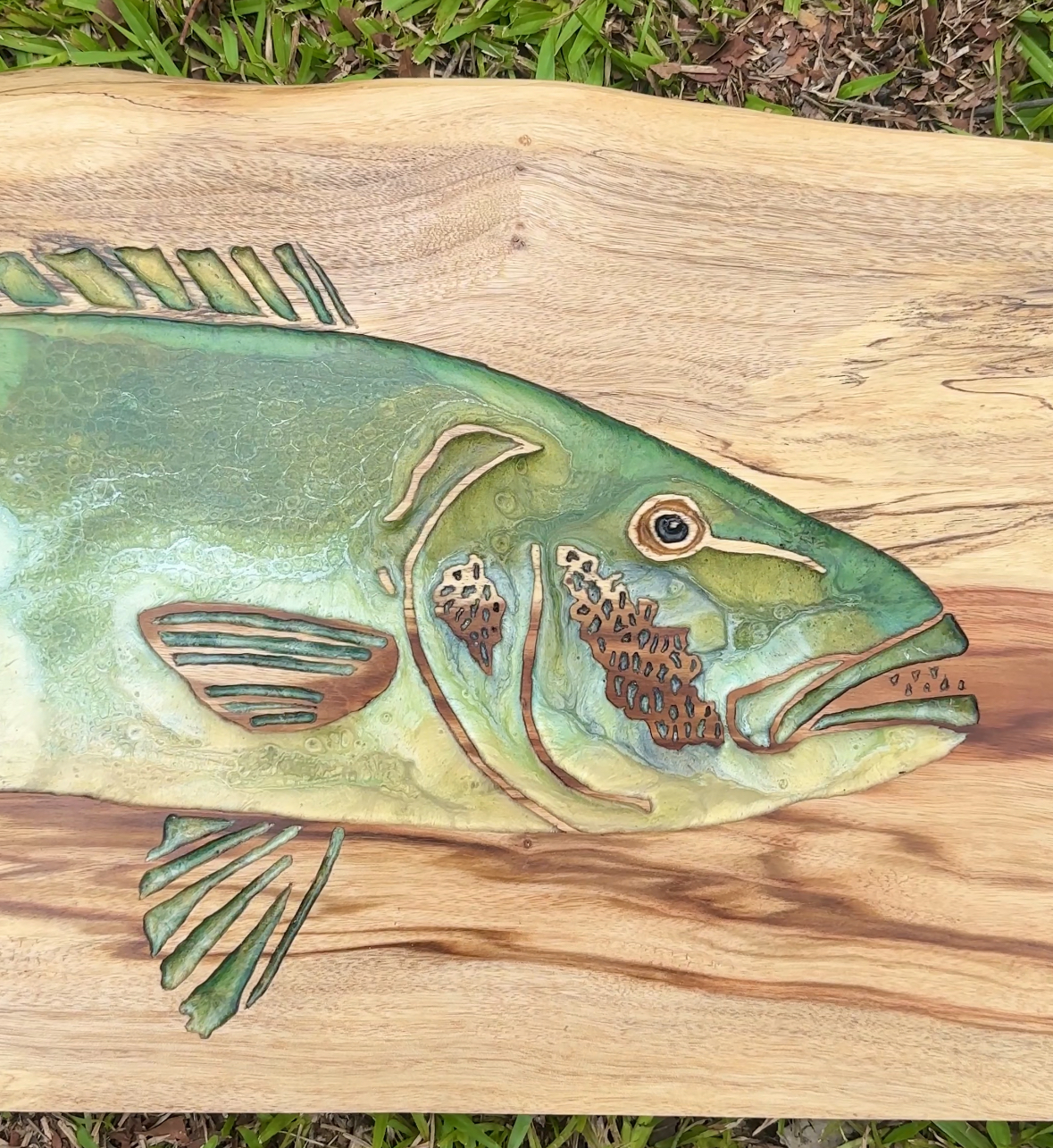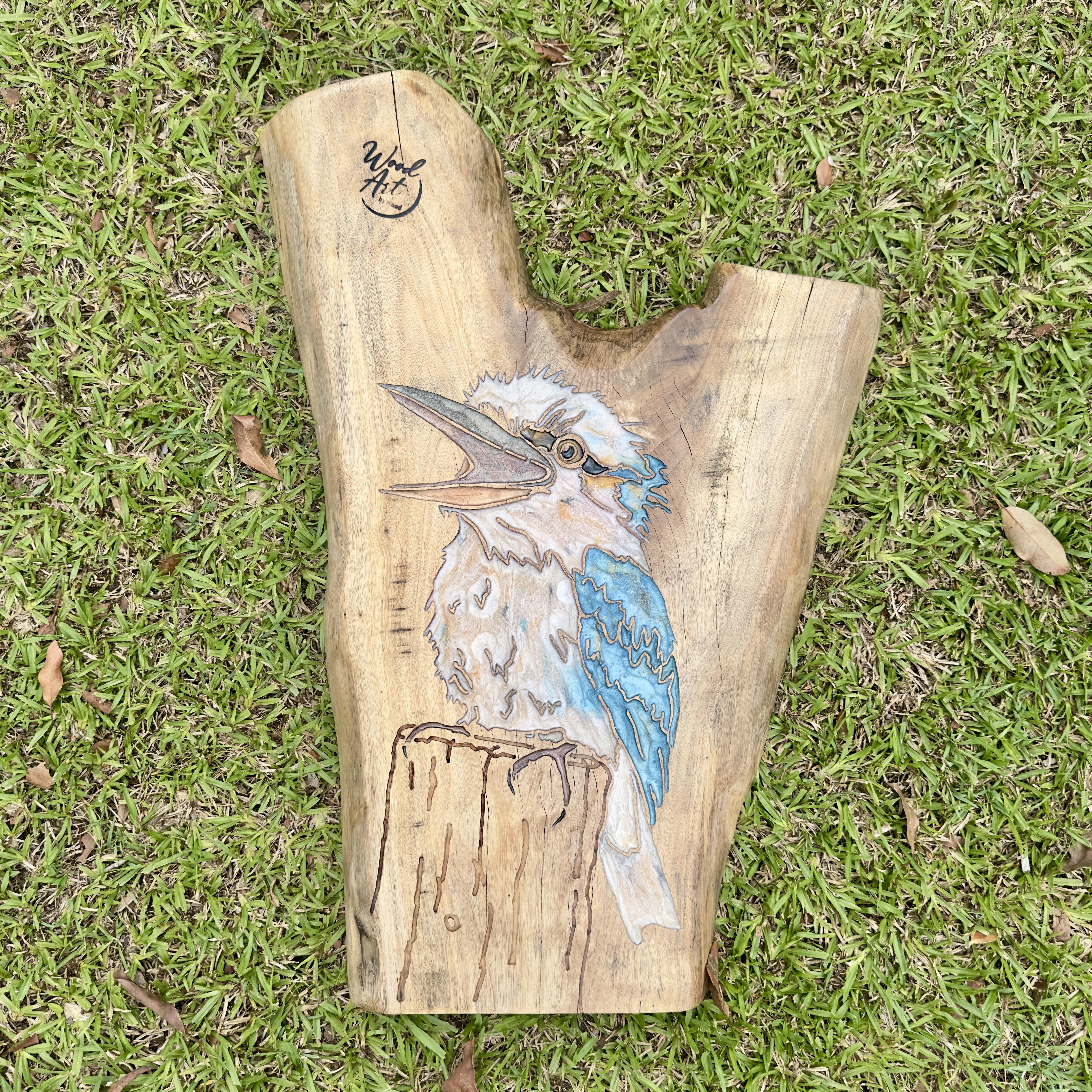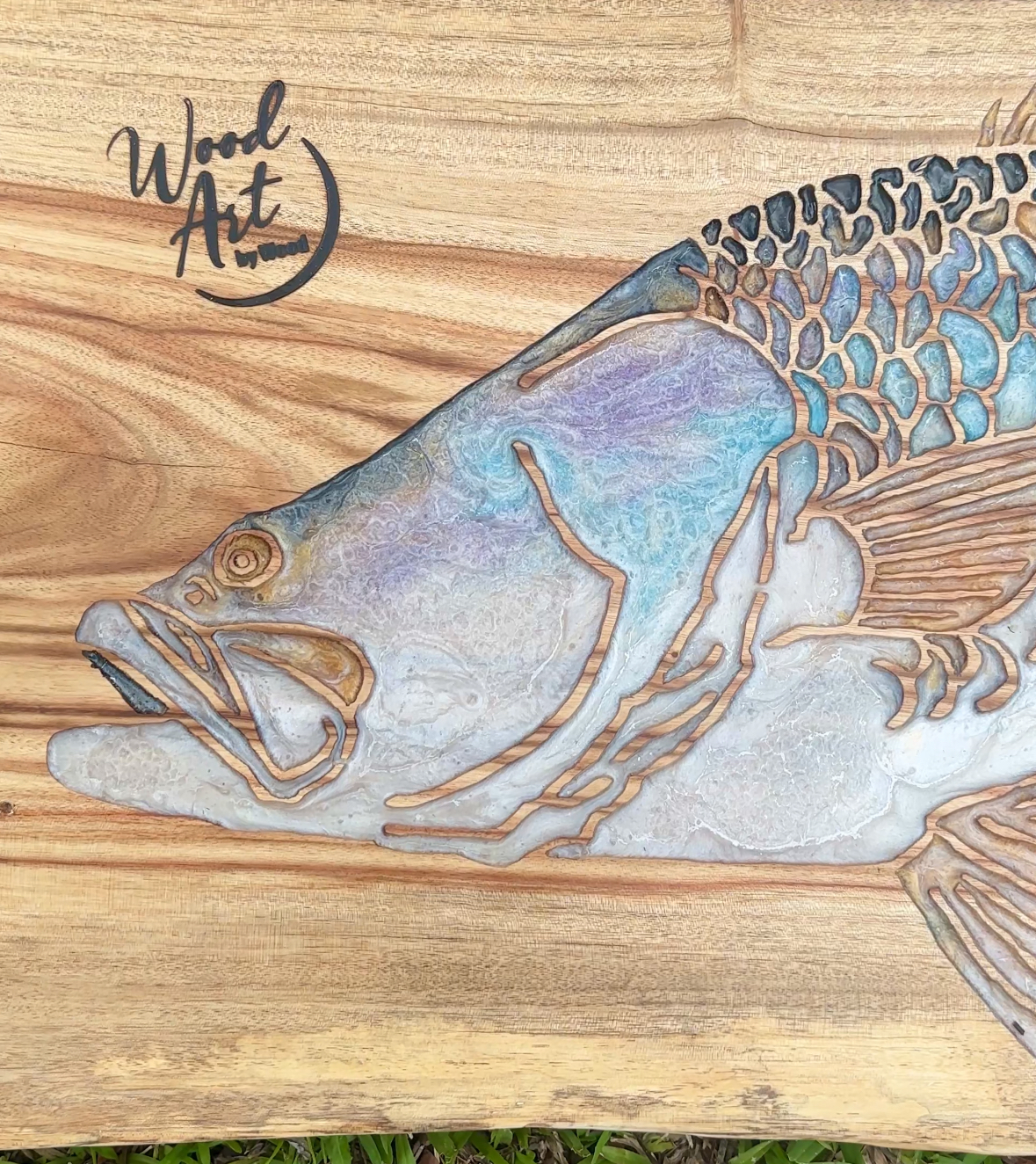 Camphor Laurel timber and epoxy resin with the Wood Art by Wood logo burnt into the timber as a seal of authenticity. Finished with a polyurethane varnish. 730mm long 600mm wide and 20mm thick. Weighs approximately 2.5kg. Braided wire attached on the back for wall mounting.