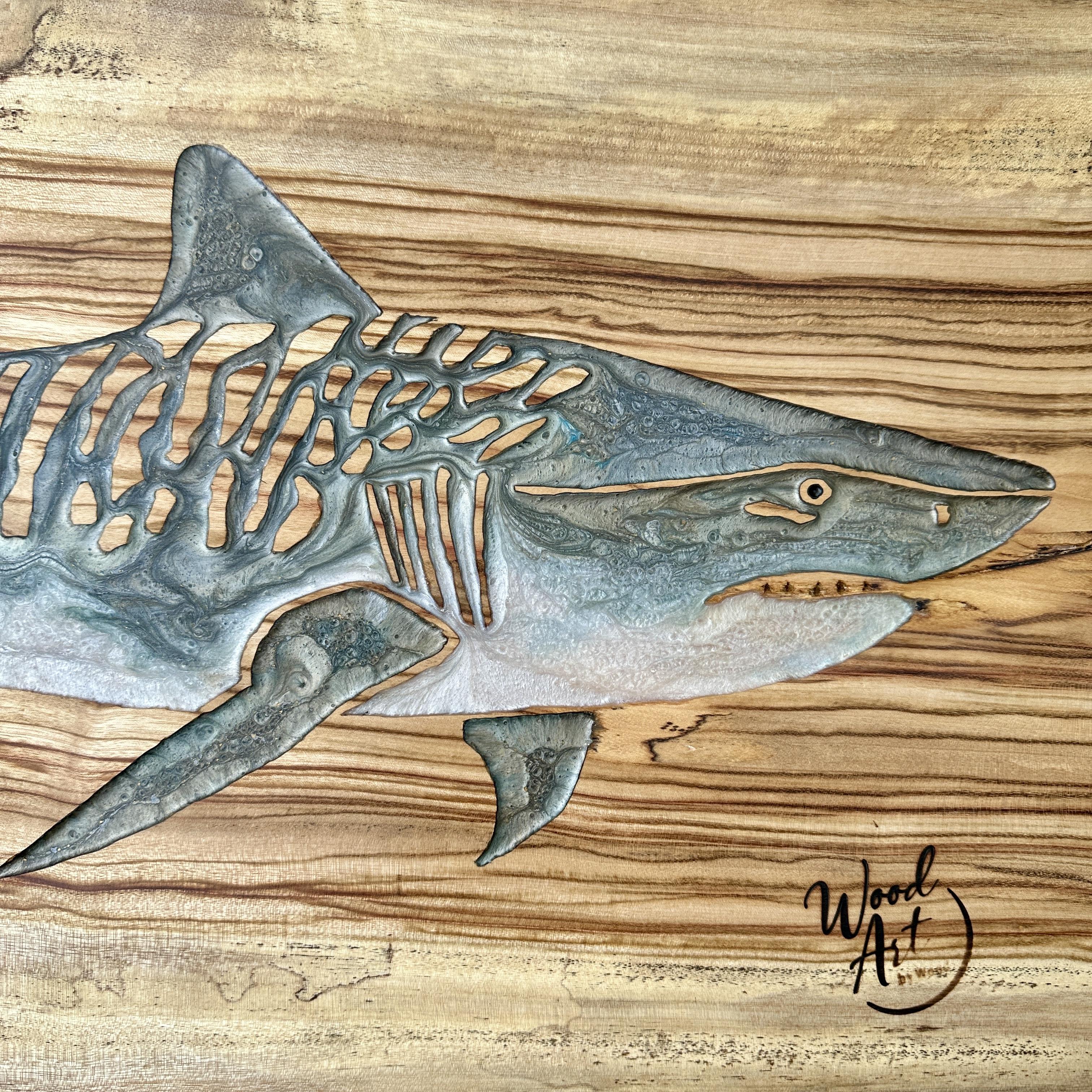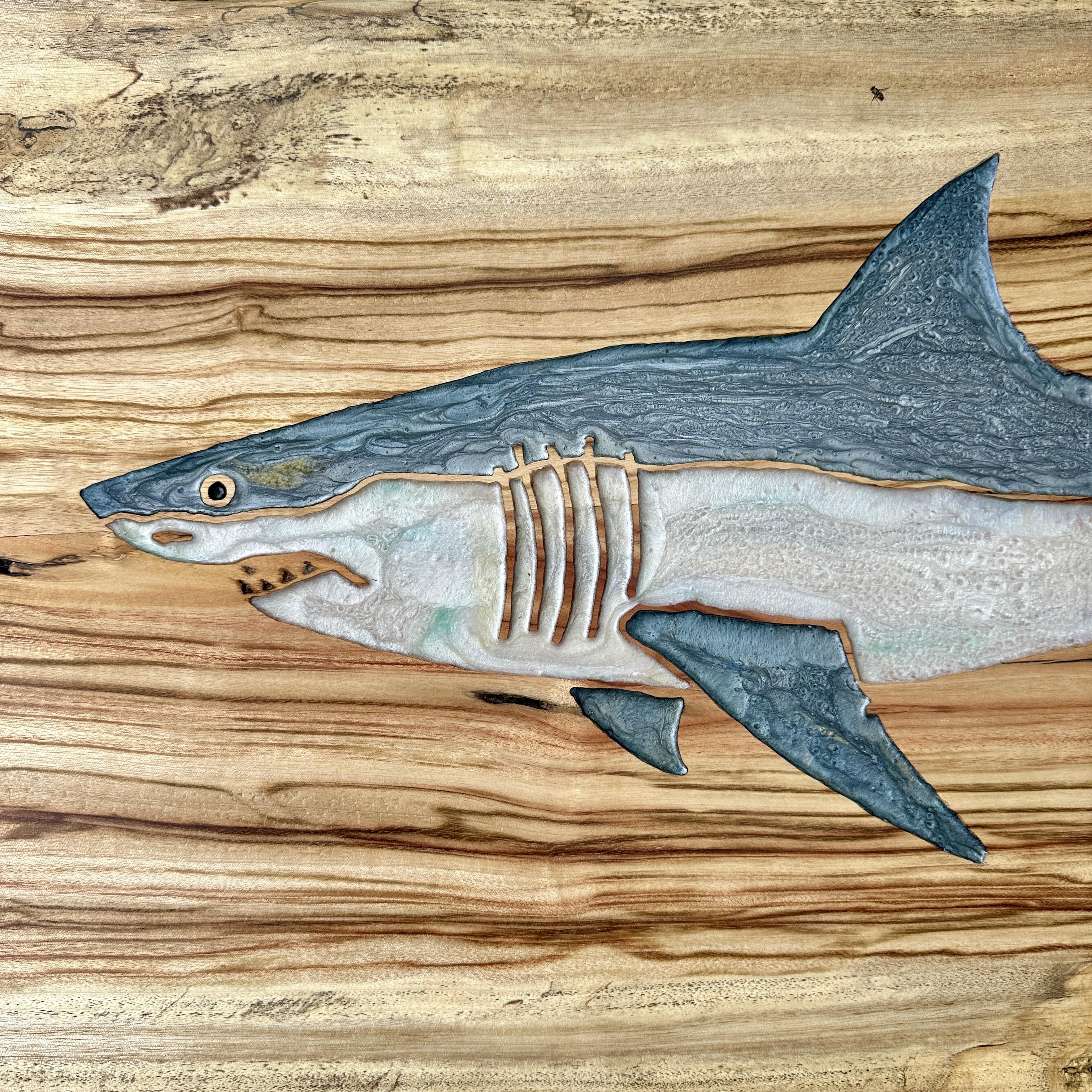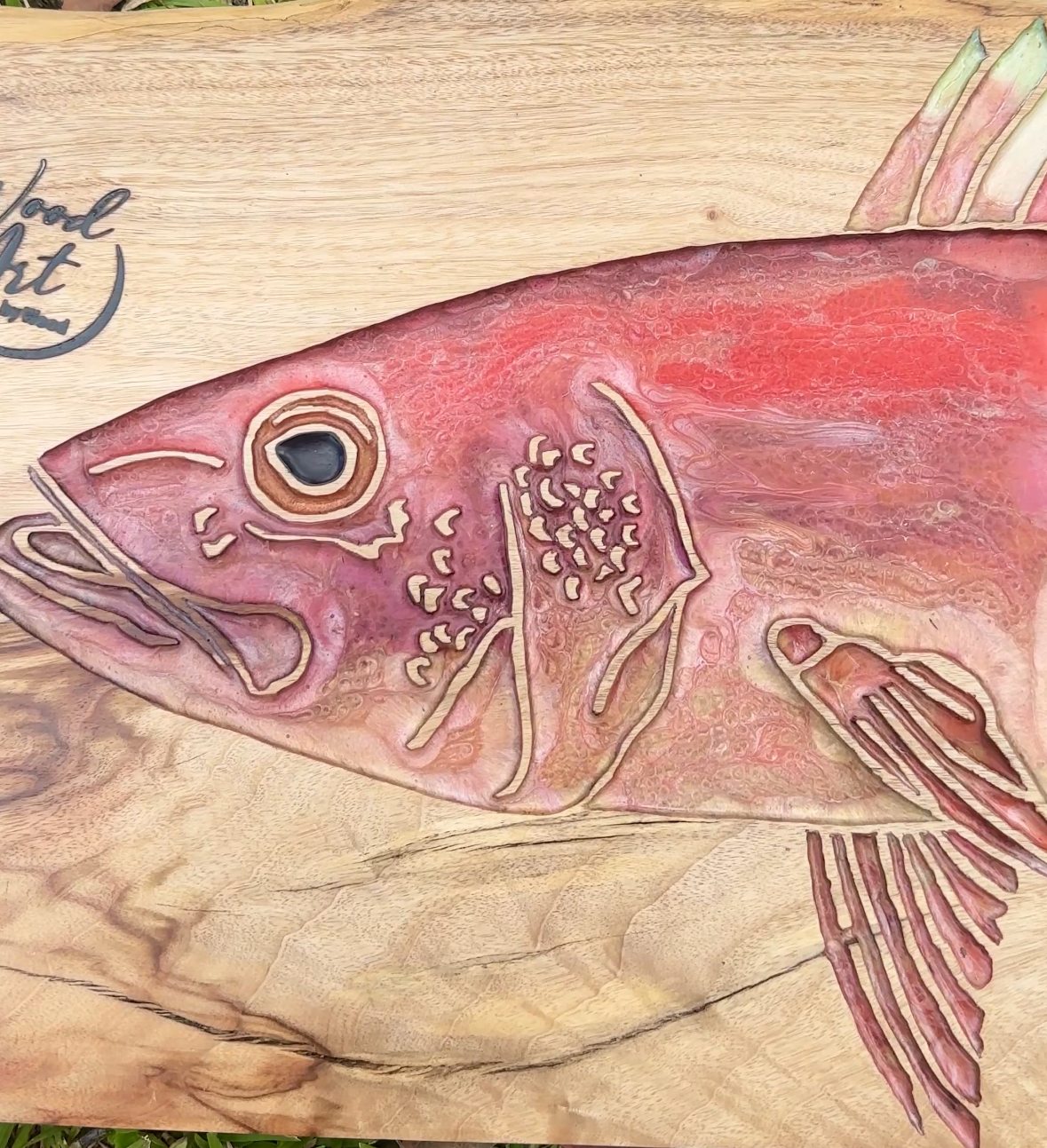 Camphor Laurel timber and epoxy resin with the Wood Art by Wood logo burnt into the timber as a seal of authenticity. Finished with a polyurethane varnish. 730mm long 600mm wide and 20mm thick. Weighs approximately 2.5kg. Braided wire attached on the back for wall mounting.